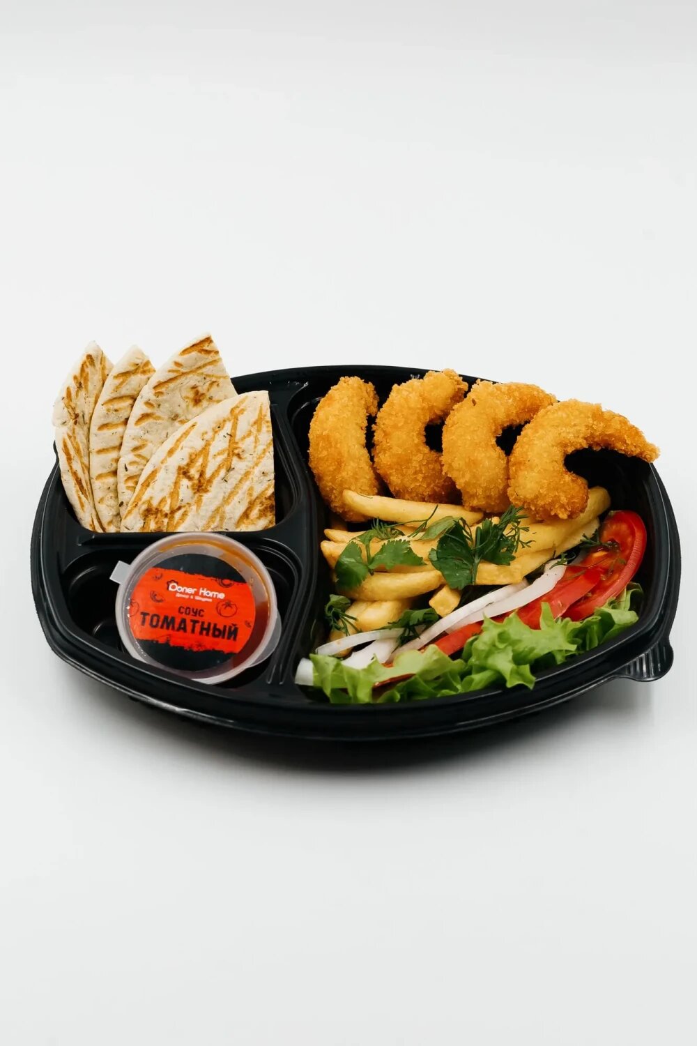 Соус на выбор, картошка фри, салат, лук красный, помидоры, креветки игровые в панировке, зелень, фирменный острый соус и пита.