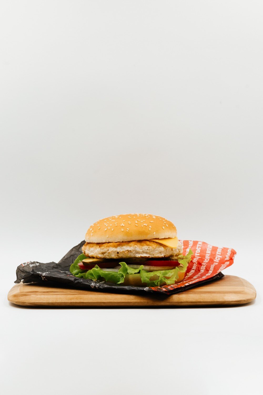 Булочка, соус тысяча островов, салат, лук, помидоры, огурцы маринованные, котлета курица, сыр чеддер.