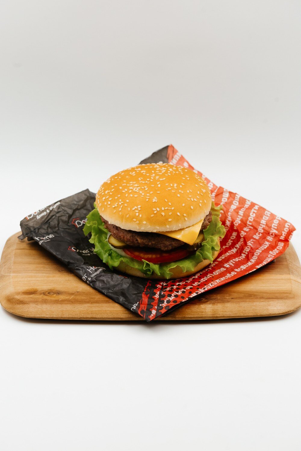 Булочка, соус тысяча островов, салат, лук, помидоры, огурцы маринованные, двойная котлета из говядины, сыр чеддер.